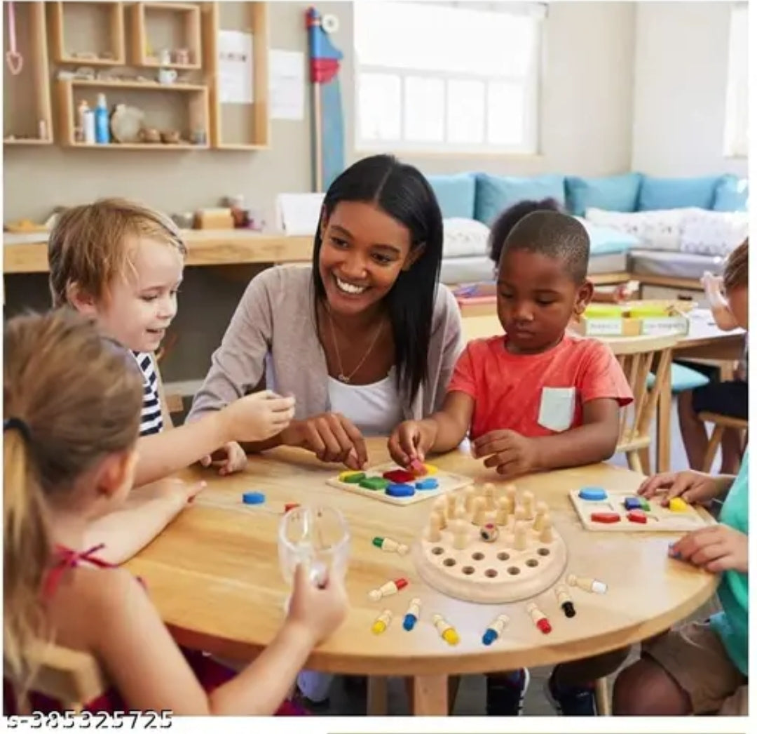 This fun and educational game is designed to boost memory, focus, and color recognition skills in kids and adults alike. The game consists of a round wooden board filled with peg-shaped pieces, each hiding a colored tip underneath. Players roll a color die and try to find the peg with the matching color.